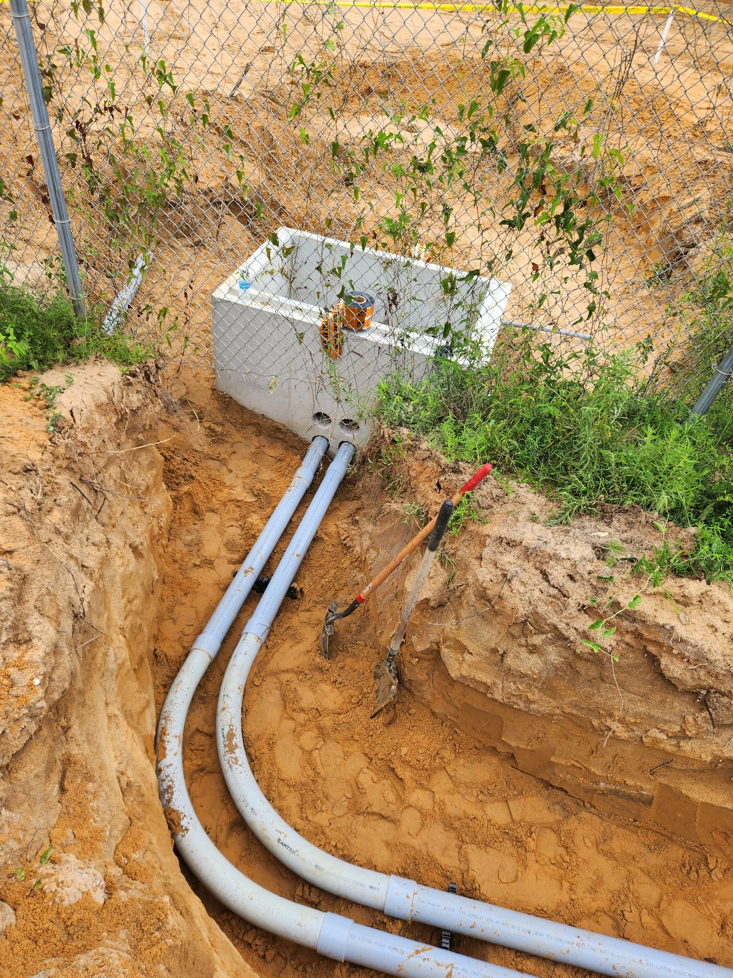 excavated area with pipes and a white utility box, surrounded by dirt, grass, and a chain-link fence with climbing plants