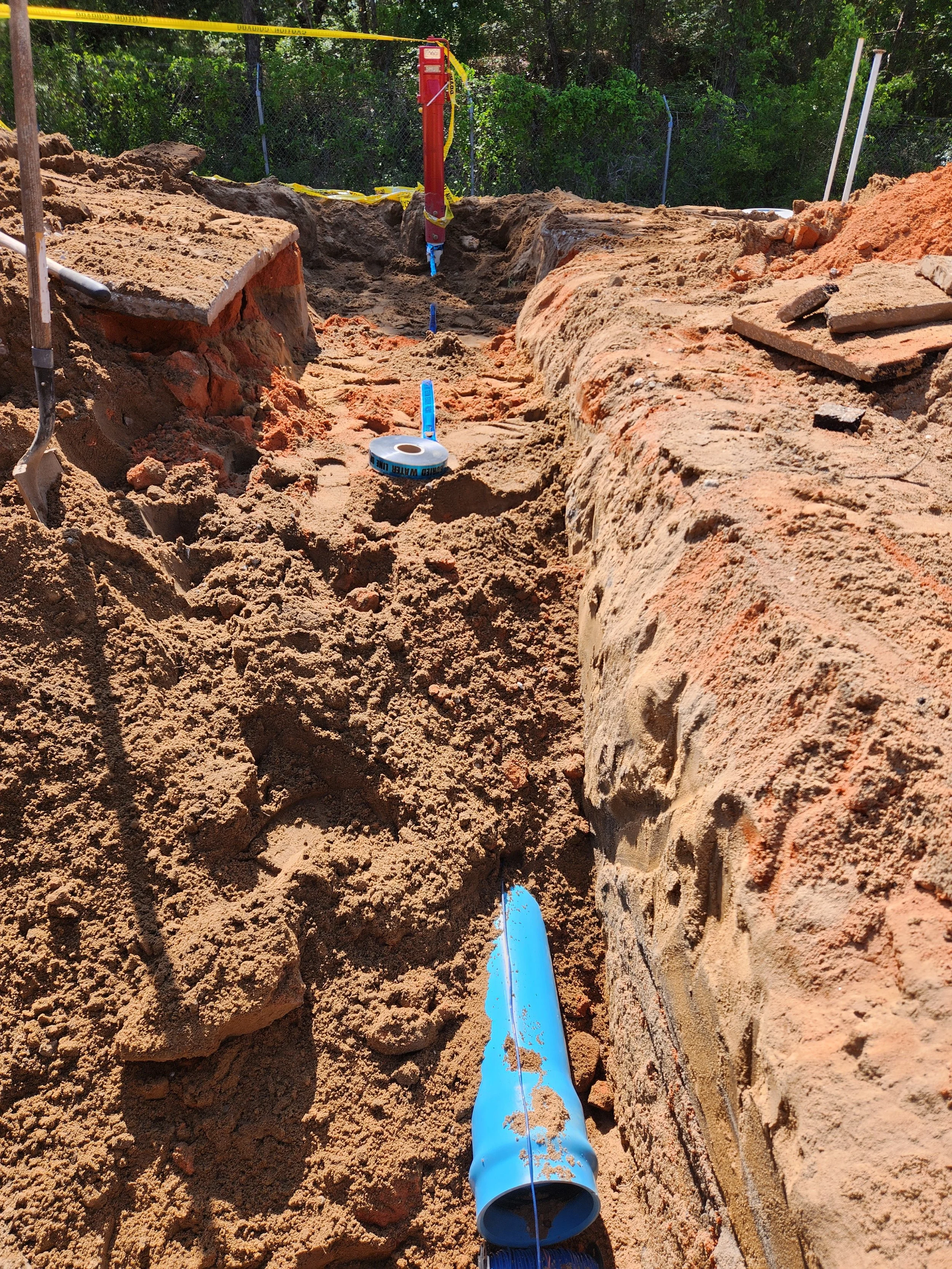 Underground utility or plumbing trench with orange-red soil, blue marker flags, and a blue pipe. Excavation site with tools and caution tape.