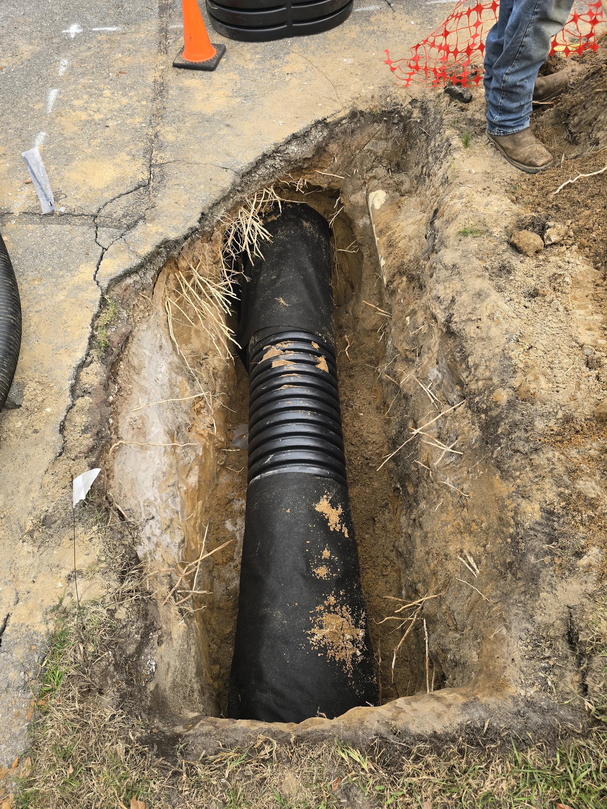 A large black pipe is installed in a trench in the ground, surrounded by dirt and roots. Construction cones and equipment are nearby, with a worker standing on the edge of the trench.